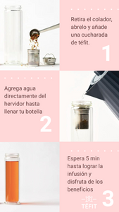 A la hora de hidratarse no importa solo cuánta agua se toma, sino también cuándo se toma. Lo ideal es que lo hagamos a lo largo de todo el día y, para eso, TÉFIT tiene un aliado en forma de botella con un diseño que no puede ser más bonito , con cristal de doble pared, capacidad de 500 ml y un colador de té integrado. Una de las ventajas de esta botella es que puedes utilizarla tanto para tus infusiones calientes como para prepararte los tés en frío.