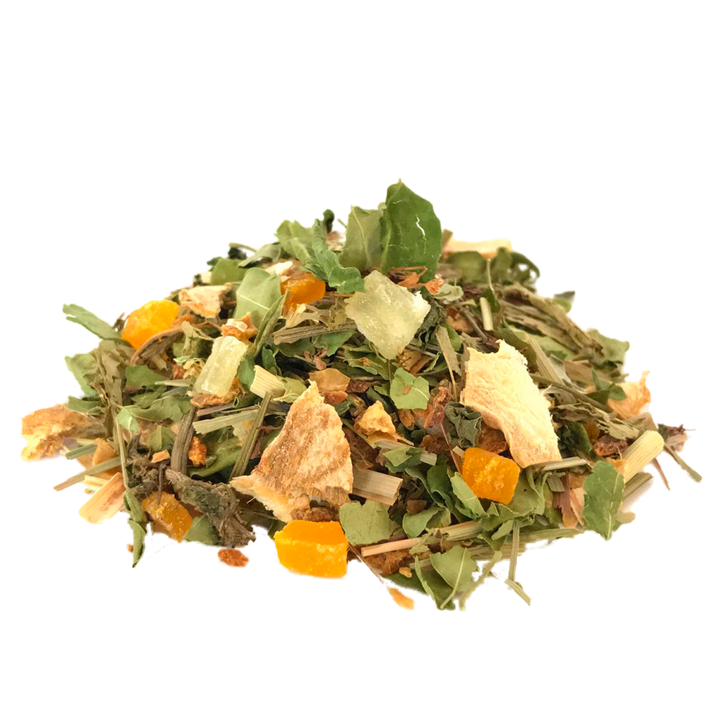 CITRUS: Trozos de café verde del Amazonas, moringa en hojas prepicadas, cáscara de limón, cáscara de naranja, lemongrass, hojas de stevia natural, jengibre en láminas, mix de cítricos seleccionados, hojas de ortiga, trozos de fruta piña y mango deshidratadas.