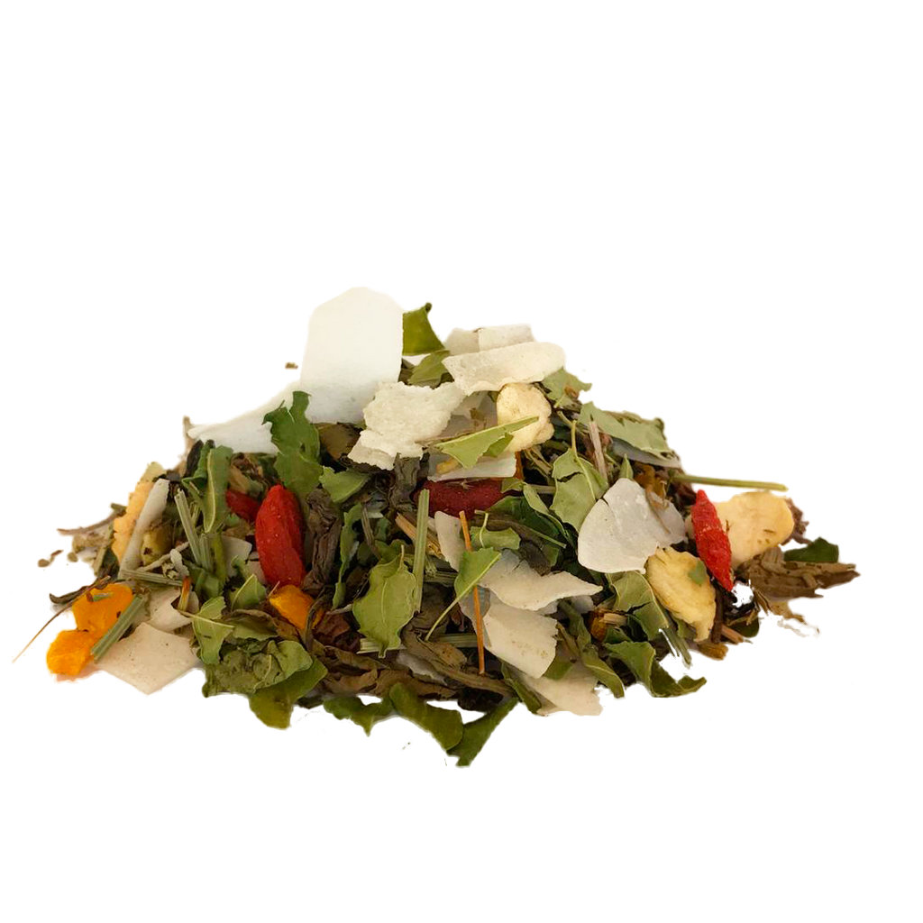 Todos los ingredientes: café verde, trocitos de mango, té verde con guayaba, láminas de coco natural, piña deshidratada, moringa, hojas de stevia natural, manzana y bayas de goji